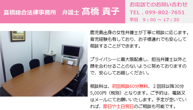当事務所では、女性弁護士が完全個室でプライバシーに最大限配慮したうえで相談をお受けしております。また、受付時もできる限り直接弁護士が対応するよう心がけておりますので、安心してお越しいただけます。